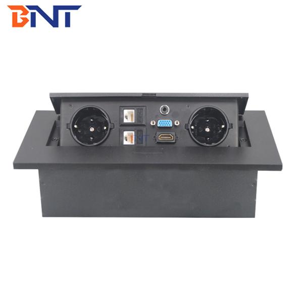 BD640EU series desktop socket box with muti-functional configuration, it can be hidden into the table after installation when unuse. Just to press the control button,the socket panel will 45 degree pop up form the desktop for use, Once it is unuse, press the panel to the desk to close.Then the panel of the socket will be flush with the desktop.